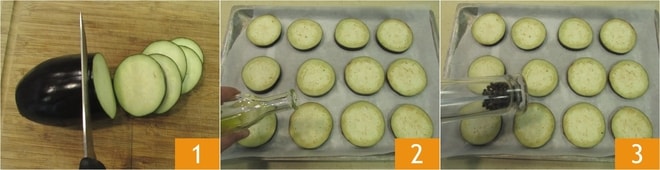Um die überbackenen Auberginen zuzubereiten, waschen Sie zuerst die Auberginen und schneiden Sie sie in etwa 1 cm dicke Scheiben 1. Legen Sie die Auberginenscheiben auf ein mit Backpapier ausgelegtes Blech und würzen Sie sie mit Öl 2, Salz und Pfeffer 3. Backen Sie sie im vorgeheizten Umluftofen bei 200° für 20 Minuten.