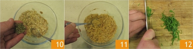 Zum Schluss würzen Sie mit Oregano 10 und mischen Sie, um die Zutaten zu verbinden 11. Hacken Sie die frische Minze fein 12.