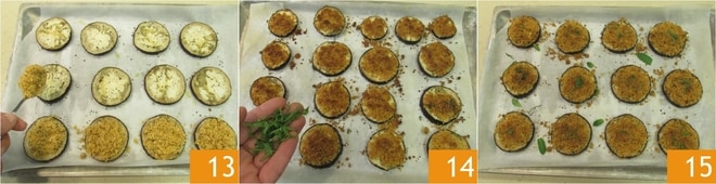 Nach der Backzeit nehmen Sie die Auberginen aus dem Ofen und verteilen Sie die Panade auf jede Scheibe 13. Backen Sie sie erneut für 3 Minuten unter Verwendung der Grillfunktion bei 240°, dann garnieren Sie mit der gehackten Minze 14. Ihre überbackenen Auberginen sind servierfertig 15!