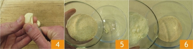 In der Zwischenzeit bereiten Sie die Panade vor: Entfernen Sie die Keime der Knoblauchzehe 4, dann hacken oder zerdrücken Sie sie in einer Schüssel. Geben Sie das Paniermehl 5 und den geriebenen Parmesan 6 hinzu.