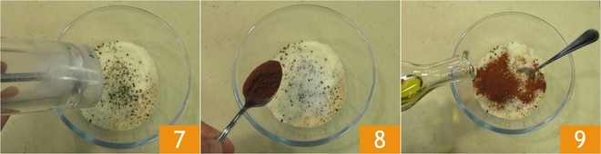 Fügen Sie das Salz 7, Paprika 8 und das Öl 9 hinzu.