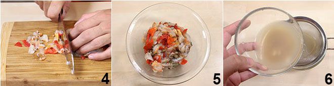 Auf einem Schneidebrett hacken Sie die Fasolare grob mit einem Messer und geben Sie sie in eine Schüssel (4-5). Filtern Sie das gesammelte Wasser 6 und stellen Sie alles beiseite.