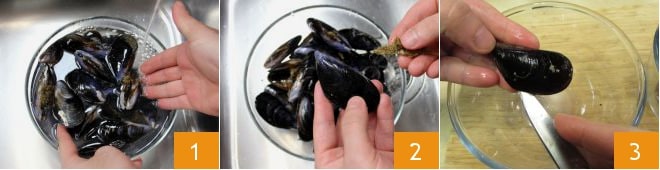 Um die gratinierten Miesmuscheln zuzubereiten, kümmern Sie sich zuerst um die Reinigung: Verwerfen Sie die geöffneten Muscheln und bewahren Sie nur die geschlossenen auf. Nachdem Sie sie unter fließendem Wasser abgespült haben 1, entfernen Sie das Byssus, also die kleinen Fäden, die aus den Schalen herausragen, indem Sie daran ziehen 2. Öffnen Sie die Muschel vorsichtig, indem Sie ein kleines Messer an der Stelle einführen, an der sie sich teilt, und den gesamten Rand entlangfahren 3,