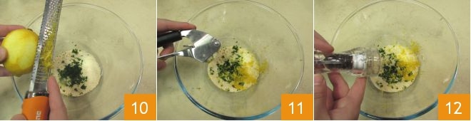 die Zitronenschale 10, eine zerdrückte Knoblauchzehe 11 und eine Prise schwarzen Pfeffer 12 hinzufügen.