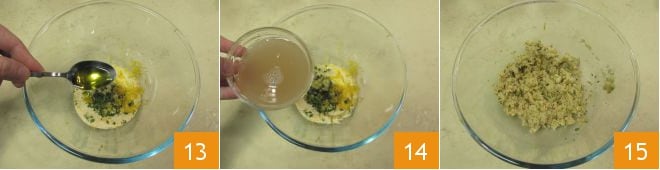 Nun 30 g Olivenöl 13 und 150 g gefilterten Muschelsaft 14 hinzugeben. Mischen Sie, um eine homogene und feuchte Masse zu erhalten 15.