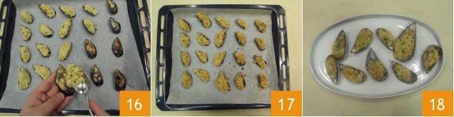 Füllen Sie die Muscheln mit einem Löffel 16, würzen Sie sie mit einem Schuss Olivenöl 17 und backen Sie sie im vorgeheizten statischen Ofen bei 200° für 12 Minuten auf der oberen Schiene und dann für weitere 3 Minuten bei maximaler Leistung im Grillmodus. Nach dem Backen 17 nehmen Sie die gratinierten Muscheln aus dem Ofen und servieren Sie sie sofort 18.