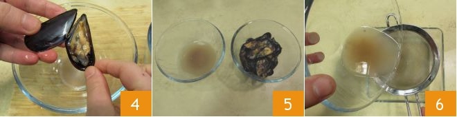 sodass beim Öffnen der Muschelfleisch intakt und an der Schale haftend bleibt 4. Machen Sie auf die gleiche Weise mit allen weiter und bewahren Sie ihren Saft auf 5, indem Sie ihn durch ein Sieb filtern 6: Er wird benötigt, um das Paniermehl zu befeuchten.