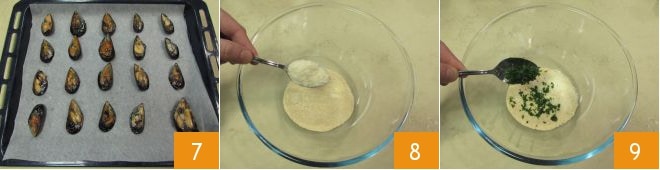 Während Sie die Muscheln öffnen, legen Sie sie auf ein mit Backpapier ausgelegtes Blech 7. Bereiten Sie die Panade vor: In einer Schüssel das Paniermehl, den geriebenen Grana Padano 8, die gehackte frische Petersilie 9,