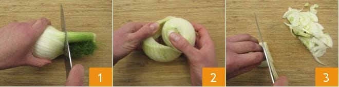 Um die gratinierte Pasta mit Fenchel und Béchamelsauce zuzubereiten, bringen Sie einen Topf mit reichlich Wasser zum Kochen, den Sie zum Kochen der Pasta benötigen. Salzen Sie das Wasser, sobald es kocht. Dann machen Sie weiter mit dem Fenchel: Entfernen Sie die obere 1 und untere Spitze, entfernen Sie die äußerste Schicht 2 und schneiden Sie den Fenchel in dünne Scheiben 3. Insgesamt sollten Sie etwa 290 Gramm geputzten Fenchel erhalten. Beiseite stellen.