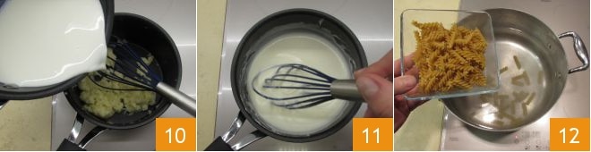dann gießen Sie die Milch nach und nach unter ständigem Rühren mit einem Schneebesen hinzu 10. Lassen Sie die Creme bei mittlerer Hitze eindicken, ohne aufzuhören zu rühren, bis Sie eine glatte und gleichmäßige Béchamelsauce erhalten 11. Schalten Sie die Hitze aus und stellen Sie sie vorübergehend beiseite. Wenn das Wasser zum Kochen der Pasta zum Kochen gekommen ist, salzen Sie es und kochen die Pasta etwa 8 Minuten lang (sie sollte dennoch al dente gekocht werden) 12.