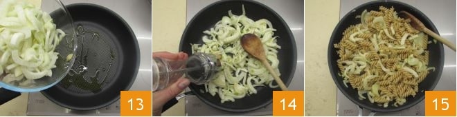 In der Zwischenzeit erhitzen Sie einen Schuss Öl in einer Pfanne zusammen mit einer zerdrückten Knoblauchzehe in der Schale, fügen Sie den Fenchel hinzu 13, würzen Sie mit Salz und Pfeffer 14 und kochen Sie ihn etwa 5 Minuten lang bei mittlerer Hitze, damit er noch knusprig bleibt. Nach der angegebenen Zeit entfernen Sie den Knoblauch, lassen Sie die Pasta direkt in die Pfanne mit dem Fenchel ab und mischen Sie gut 15 und braten Sie alles eine Minute lang bei mittlerer Hitze an.