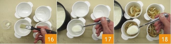Buttern Sie 4 Förmchen mit einem Durchmesser von 10 cm 16 und bedecken Sie den Boden mit einem Esslöffel Béchamelsauce 17, dann füllen Sie die Formen zur Hälfte mit der Pasta und dem Fenchel und fügen Sie jeweils 2 weitere Esslöffel Béchamelsauce hinzu 18.
