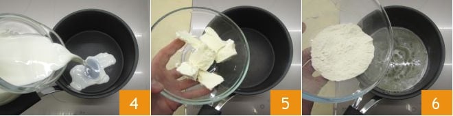 Bereiten Sie die Béchamelsauce vor: Erhitzen Sie die Milch in einem kleinen Topf 4 und schmelzen Sie die Butter bei schwacher Hitze in einem separaten kleinen Topf 5. Sobald die Butter geschmolzen ist, fügen Sie das Mehl auf einmal hinzu 6