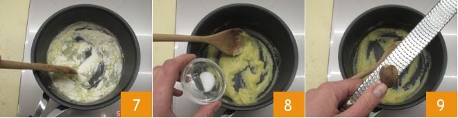 und rühren Sie gut, um die Bildung von Klumpen zu vermeiden 7, bis Sie eine goldene Mehlschwitze erhalten. Fügen Sie nun das Salz 8 und den geriebenen Muskatnuss 9 hinzu (oder Sie können es hinzufügen, wenn die Béchamelsauce fertig ist),