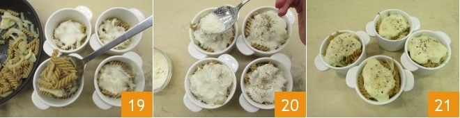 Fügen Sie noch mehr Pasta hinzu, bis Sie den Rand der Förmchen erreichen 19, und vervollständigen Sie mit einer großzügigen Menge an Béchamelsauce, einer Prise Pfeffer und einem Esslöffel geriebenem Parmesan 20. Backen Sie die Förmchen im vorgeheizten statischen Ofen bei 200° etwa 10 Minuten lang, bis sie schön goldbraun auf der Oberfläche sind. Ihre gratinierte Pasta mit Fenchel und Béchamelsauce ist bereit, heiß serviert zu werden 21!