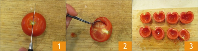 Um die überbackenen Tomaten zuzubereiten, waschen Sie die Tomaten, halbieren Sie sie 1, entnehmen Sie das Fruchtfleisch, das Sie für die Füllung verwenden, und bewahren Sie die ausgehöhlten Hälften auf 3.