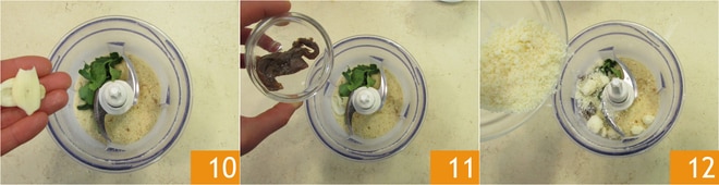 Fügen Sie die geschälte und halbierte Knoblauchzehe hinzu (Sie können den Keim entfernen, bevor Sie ihn verwenden) 10, die vom Konservierungsöl abgetropften Sardellen 11 und den geriebenen Käse 12. Würzen Sie mit einer Prise Salz, aber gehen Sie in dieser Phase sparsam damit um, da der geriebene Käse bereits salzig ist.