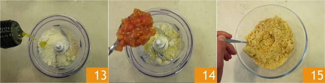 Geben Sie schließlich das Öl 13 und das abgetropfte Fruchtfleisch der Tomaten hinzu 14 und hacken Sie alles im Mixer, bis Sie eine homogene Brotkrumenfüllung erhalten 15.