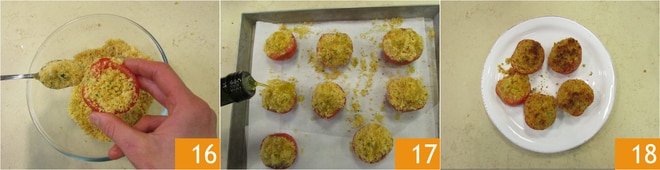 Füllen Sie jede Tomatenhälfte mit der erhaltenen Füllung 16, legen Sie die Tomaten auf ein mit Backpapier ausgelegtes Blech und ölen Sie die Tomaten leicht ein 17. Backen Sie im Umluftofen bei 200°C für 10-12 Minuten oder bis zur Bräunung. Servieren Sie die gratinierten Tomaten heiß 18.