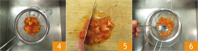 Lassen Sie das Fruchtfleisch vom überschüssigen Wasser abtropfen 4, hacken Sie es dann mit einem Messer 5 und lassen Sie es erneut abtropfen, um weiteres überschüssiges Wasser zu entfernen 6.