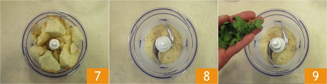 Schneiden Sie das altbackene Brot grob 7, bevor Sie es im Mixer zerkleinern 8. Fügen Sie die Petersilie hinzu 9.