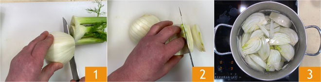Um den Fenchel auf mediterrane Art zu überbacken, reinigen Sie zuerst den Fenchel 1 und schneiden ihn in ziemlich dicke Scheiben 2. Den Fenchel 5 Minuten lang in Salzwasser blanchieren 3.<\/p>