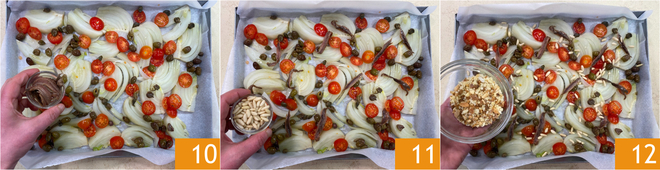 Fügen Sie auch die Sardellen 10 und die Pinienkerne 11 hinzu, dann mit Paniermehl 12 und getrocknetem Oregano bestreuen.<\/p>