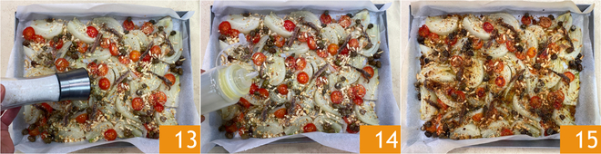 Salzen 13, pfeffern und schließlich mit einem Schuss Öl 14 würzen. Im vorgeheizten statischen Ofen bei 180° etwa 20 Minuten backen oder bis sich eine goldene Kruste bildet. Herausnehmen und sofort den überbackenen Fenchel auf mediterrane Art servieren 15!<\/p>