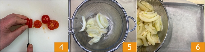 In der Zwischenzeit die Kirschtomaten in Scheiben schneiden 4. Den Fenchel abtropfen lassen 5 und auf ein mit Backpapier ausgelegtes Blech verteilen 6.<\/p>