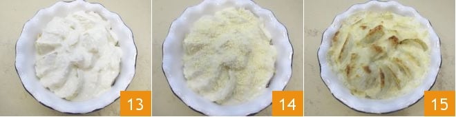 Gießen Sie die Béchamelsauce darüber 13, bestreuen Sie die Oberfläche mit geriebenem Parmigiano Reggiano 14 und backen Sie sie im vorgeheizten statischen Ofen bei 200°C für etwa 20-25 Minuten (oder im Umluftofen bei 180°C für 15-20 Minuten), bis eine goldene Kruste entsteht. Aus dem Ofen nehmen und leicht abkühlen lassen, bevor Sie Ihren gratinierten Fenchel servieren 15!