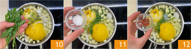 Fahren Sie fort mit der Petersilie 10, dem groben Salz 11 und dem rosa Pfeffer 12. Bringen Sie alles zum Kochen und lassen Sie es etwa 30 Minuten köcheln.