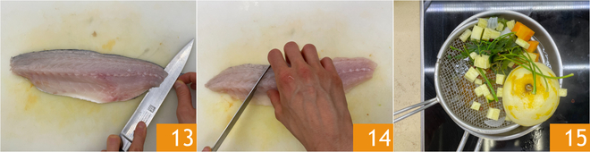 In der Zwischenzeit entfernen Sie die Haut von den Wolfsbarschfilets 13 und schneiden Sie jedes Filet in 3 Rauten 14. Nach der Kochzeit entfernen Sie das Gemüse aus der Brühe 15.