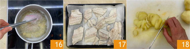 Kochen Sie den Wolfsbarsch etwa 2 Minuten lang in der Brühe 16. Abtropfen lassen und auf Küchenpapier ruhen lassen 17. Entfernen Sie die Schale der Kartoffeln, schneiden Sie sie in Scheiben 18 und stellen Sie sie beiseite.