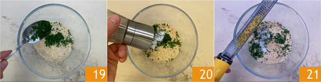 Für die Panade geben Sie Semmelbrösel in eine Schüssel und fügen die gehackte Petersilie 19, Salz, Pfeffer 20, Zitronenschale 21 hinzu und mischen alles.