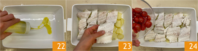 In einer Auflaufform von 30x20 cm geben Sie einen Schuss Öl 22 und legen die Kartoffeln auf den Boden. Den Wolfsbarsch auf das Kartoffelbett legen 23 und mit den halbierten Tomaten bedecken 24.