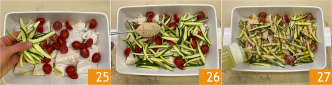 Fahren Sie mit den Zucchinistreifen fort 25 und bedecken Sie alles mit der Panade 26. Abschließend mit einem Schuss Öl beträufeln 27.