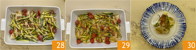 Nachdem die Schichtung abgeschlossen ist 28, backen Sie bei 180°C im statischen Ofen etwa 15 Minuten lang 29. Ihr gratinierter Wolfsbarsch mit Tomaten, Kartoffeln und Zucchini ist bereit, heiß serviert zu werden 30.
