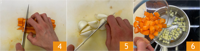 Schneiden Sie die Karotten in Würfel 4, die Zwiebel in Spalten 5. Bereiten Sie nun den Court-Bouillon, also die aromatische Brühe, vor. Geben Sie in einen Topf Wasser und fügen Sie den Zucchinikern und die Karotten hinzu 6.