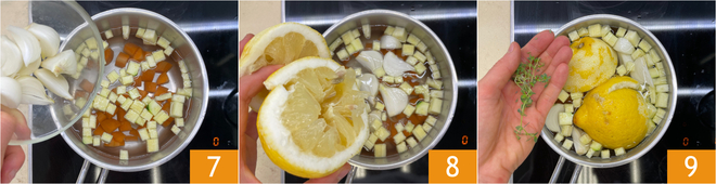Fügen Sie die Zwiebel 7, den Zitronensaft, die gepresste Zitrone 8 und den Thymian hinzu 9.