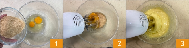 Um das Tiramisu mit griechischem Joghurt zuzubereiten, beginnen Sie mit dem Biskuitboden: Geben Sie den Zucker und die Eier in eine Schüssel 1, dann schlagen Sie sie mit einem elektrischen Mixer etwa zehn Minuten lang 2 oder bis die Mischung hell und schaumig aussieht 3.