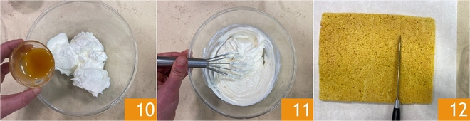 In der Zwischenzeit widmen Sie sich der Joghurtcreme: Geben Sie den griechischen Joghurt und den Honig in eine Schüssel 10, dann rühren Sie gut mit einem Schneebesen um 11. Nehmen Sie den Biskuitboden und schneiden Sie ihn in Rechtecke von der gleichen Größe wie die Auflaufform, in der Sie Ihr Tiramisu zusammenstellen werden (unsere misst 22x17 cm) 12.