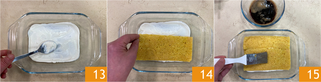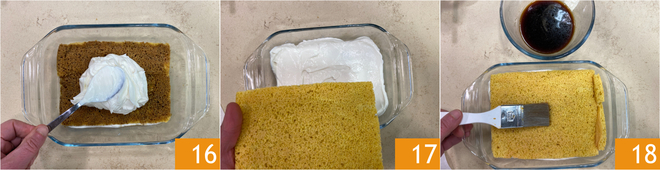 Streichen Sie etwa die Hälfte der griechischen Joghurtcreme darüber 16 und fahren Sie mit einer weiteren Schicht Biskuitboden fort 17, die Sie mit dem Kaffee tränken 18.