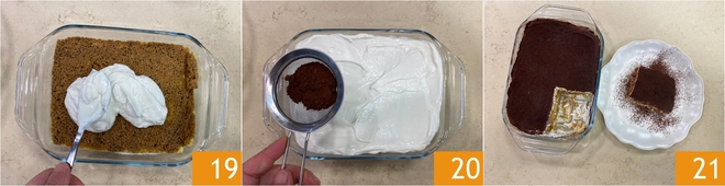 Beenden Sie mit der restlichen griechischen Joghurtcreme 19, glätten Sie sie gut, dann bestäuben Sie sie mit gesiebtem Kakaopulver 20. Lassen Sie Ihr Tiramisu mit griechischem Joghurt im Kühlschrank mindestens 2 Stunden ruhen, bevor Sie es servieren 21!