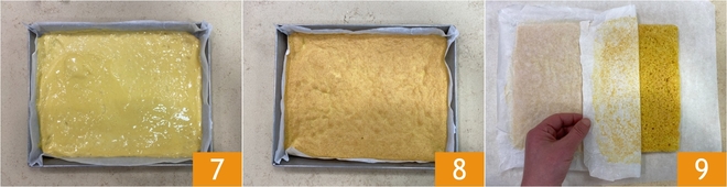Backen Sie den Biskuitboden im vorgeheizten statischen Ofen bei 180° für etwa 15 Minuten 7. Wenn er gebacken ist 8, stürzen Sie ihn auf ein Stück Backpapier und lassen Sie ihn vollständig abkühlen. Sobald er abgekühlt ist, entfernen Sie vorsichtig das obere Backpapier 9.
