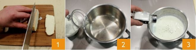 Um die Grissini mit schwarzem Pfeffer Fondue zuzubereiten, beginnen Sie mit der Fondue: Schneiden Sie den Taleggio in Scheiben 1 und dann in grobe Würfel. Geben Sie dann die Milch in einen großen Topf 2, salzen 3 und pfeffern Sie nach Belieben.