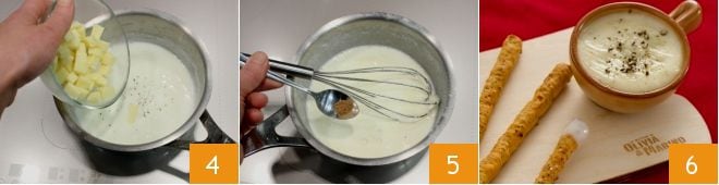 Erhitzen Sie die Milch, geben Sie dann die Taleggio-Würfel dazu 4 und lassen Sie alles bei schwacher Hitze unter Rühren mit einem Schneebesen köcheln, bis eine Creme entsteht. Kurz bevor Sie die Hitze ausschalten, fügen Sie etwas Muskatnuss hinzu 5. Übertragen Sie dann Ihre schwarze Pfeffer Fondue in kleine Gläschen oder Terrakottagefäße und servieren Sie sie zusammen mit den Grissini 6!