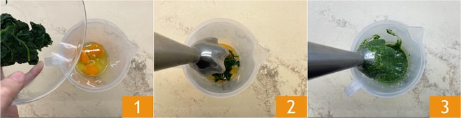 Um das grüne gefüllte Raviolone zuzubereiten, kümmern Sie sich um den frischen Teig. In einem hohen, schmalen Behälter die Eier und den gekochten und abgeseihten Spinat 1 einfüllen. Mit einem Stabmixer 2 pürieren, um eine glatte und gleichmäßige Creme zu erhalten 3.