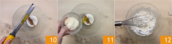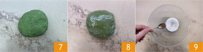 Sobald ein gleichmäßiger Teig 7 erhalten wird, wickeln Sie ihn in Frischhaltefolie 8 und lassen Sie ihn mindestens eine halbe Stunde an einem kühlen Ort ruhen. Machen Sie mit der Füllung weiter: In einer Schüssel den gut abgetropften Ricotta geben und mit Salz, Pfeffer und Muskatnuss würzen 9.