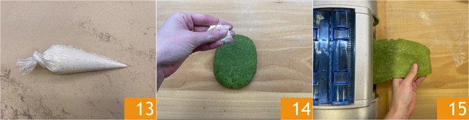Die Ricottacreme in einen Spritzbeutel 13 umfüllen. Nach dem Ruhen wird der frische Teig weicher und elastischer, einen Teil des Teigblocks mit wenig Mehl auf der Arbeitsfläche 14 ausrollen und mit der Nudelmaschine auf die maximale Dicke 15 ausrollen. Die beiden Enden des Teigblattes zur Mitte falten und dann erneut mit sehr wenig Mehl bestreuen.