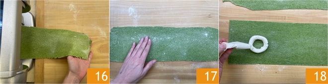 Durch die Walzen bis zur vorletzten Dicke laufen lassen, um ein Blatt mit einer Dicke von etwa 2-3 mm 16 zu erhalten, einmal ein rechteckiges Blatt erhalten, es auf einer leicht bemehlten Arbeitsfläche 17 ablegen und die Enden mit einem Teigschneider abschneiden. Mit dem Spritzbeutel Kreise erstellen 18.
